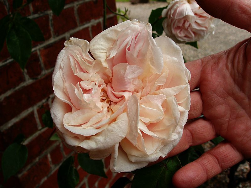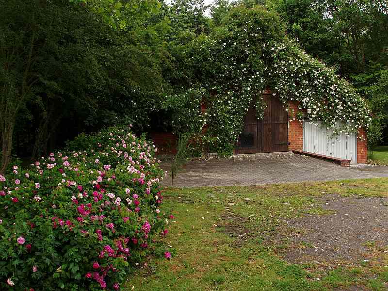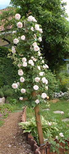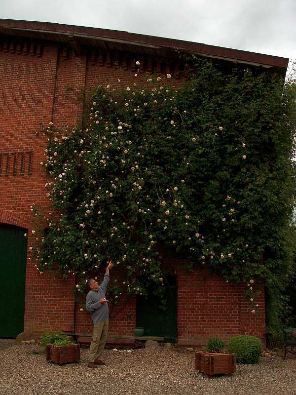 Ja, diese Hauswand haben wir im letzen Herbst auch gesehen, auch ohne Blüten war sie überaus beeindruckend. Freue mich schon für das hier versprochene Foto mit dem Blüten.Da stellte ich nun vorletzten Frühling einen Pfosten von 2.50 hin, pflanzte eine Devoniensis dran und was ist passiert?Keine Spur von apricot sondern weiss mit einem Hauch rosa. Klar, sie hat wunderbar geblüht und war ein echter Hingucker, aber es war nicht die Rose, für die ich sie gehalten habe.Es ist die SdM Clg., um mit Kai Eric zu sagen: wir haben sie um-identifiziert! Da wird mir was blühen. Den ganzen Pfosten hat sie bereits vereinnahmt, ja wohin soll sie nun weiter?Hier ein Bild, sehr schöne Blüte