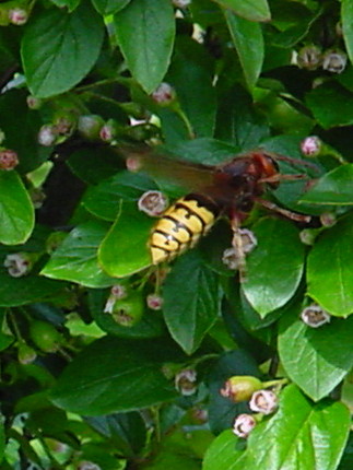 Da bin ich aber jetzt schon neidisch!Das heißt, die erste Brut ist geschlüpft, weißt du denn wo das Nest ist?Gruß Karindas wirkt jetzt etwas falschDer Cotoneaster hat sehr grosse Blaetter und Blueten. Dementsprechend ist es keine Wespe...