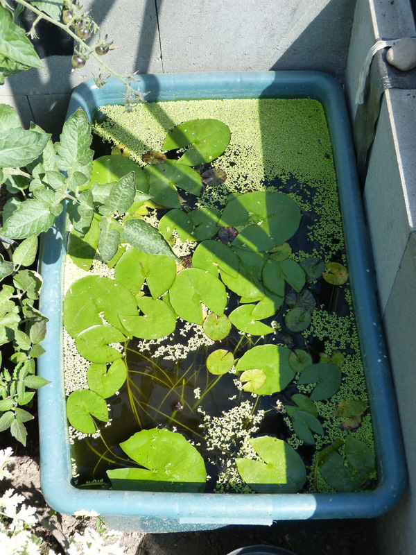 So sieht es aktuell aus - das ist eine eckige 200-l-Regentonne. Im Moment stehen drei Seerosen drin ('Purple Joy', 'Blue Aster' und 'Daeng Siam'). Ich denke, dass wird dieses Jahr etwas eng, weil die Pflanzen im Gegensatz zum letzten Jahr gut zugelegt haben. Dann zieht ggf. nochmal eine um in einen Mörtelbottich.
