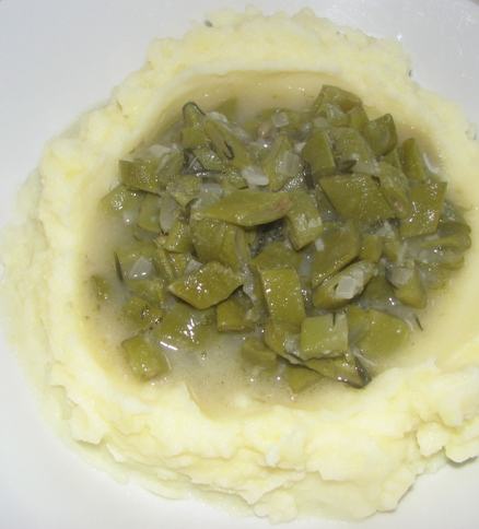 gleich gibts bohnen (halbhohe borlotti-aehnliche) in suess-saurer einbrenne auf kartoffelbrei.