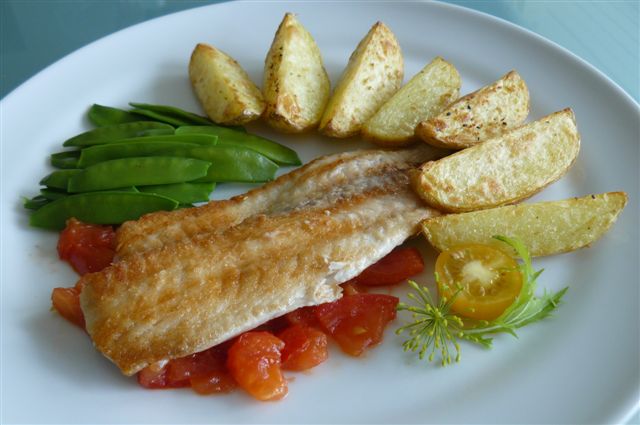 danach Tilapia auf geschmolzenen Tomaten, die ersten Zuckerschoten aus dem Garten, dazu Ofenkartoffeln