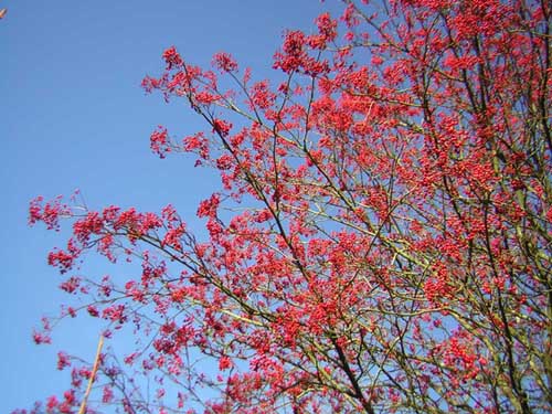 Gefragt wurde es ja schon mal (Hallo Ismene!) Ja, einige Ebereschen haben immer noch den vollen Fruchtbehang. Hier als Beispiel Sorbus 'Rose Queen' mit ihrer rosaroten Beerenpracht vor einem einzigartigen blauen Himmel, der leider momentan eine Seltenheit ist. 'Rose Queen' ist eine 1963 entstandene Kreuzung von S. commixta 'Embley' und dem Sorbus poteriifolia 13-17 Blättchen (45mm lang) , scharf gesägter Rand, Gesamtblattlänge: 15cm,