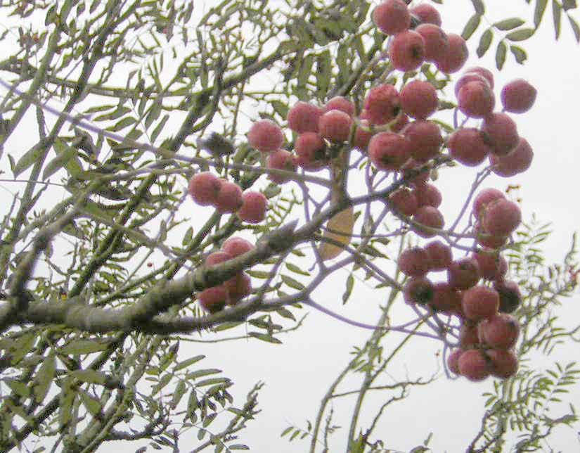 Von beutegierigen Amselschwärmen bespmders stark belauert, kann ich mir hier keine rotfrüchtigen Sorbus-Vertreter leisten. Von den beiden einzigen dieser Fruchtfarbe (S. aucuparia 'Edulis' und S. decora) sind alle Früchte innerhalb von 3-4 Tagen geplündert.Bei andersfarbigen Früchten warten die Beuteschnäbler darauf, dass sie endlich rot (reif) werden. Erst später merken sie, dass da nichts rot wird und langen zu.So habe recht lange Freude an den sehr zierenden Früchten außer vonSorbus rockii (S. aucuparia 'Joseph Rock') gelbfrüchtiganS. cashmiriana weißS. hupehensis weißS. koehneana weißS. prattii weißS. vilmorinii weiß mit rosa SchimmerS. x arnoldiana schwach rosasowie an den Zwergen mit wenig auffälligen FrüchtenS. reductaS. poteriifoliaDie gleiche Strategie verfolge ich u. a. bei gelbfrüchtiger Ilex aquifolium 'Bacciflava' und gelbfrüchtiger Cornus mas (Kornelkirsche) sowie auch der gelbfrüchtigen Süßkirsche 'Dönnissens Gelbe", über die aber dennoch als Sorte der Prunus avium (= Kirsche der Vögel = Vogel-Kirsch = Kirsche für die Vögel) bald hergefallen wird.N.B.: Ab morgen bin ich leider verreist und kann daher auf eventuelle Fragen erst später antworten.