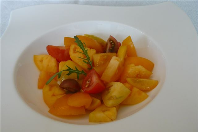 Tomatensalat danach ein Kalbssteak auf Chilisauce mit Mohnnudeln