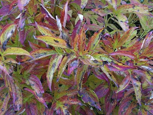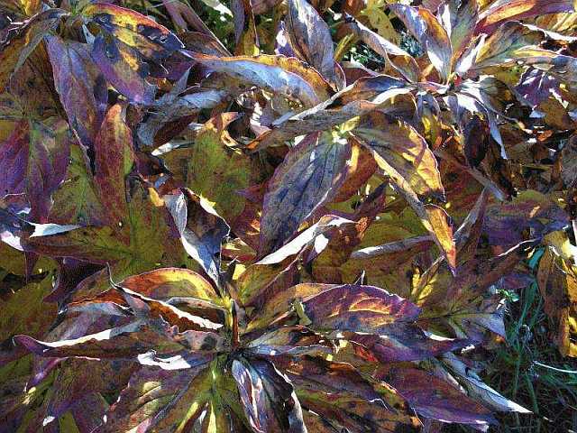 dann zeige ich mal noch ne schön herbstlich gefärbte Pfingstrose, diese ist jedes Jahr schön - im Gegensatz zu anderen, die einfach wegtrocknen. Rechts daneben Bletilla striate, die grade ihr Laub verlieren, die noch grünen Blätte sind von einem Eomecon, der einfach überall mal auftaucht.