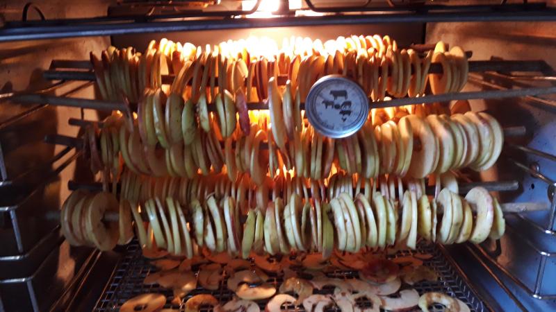 Ich habe bisher im Backofen getrocknet. Ein Backblech/Rost lässt sich angenehm mit den Obststücken belegen. Jetzt konnte ich so ein rundes Dörrsieb belegen. Ein bescheuertes im Kreislegen. Nix für mich. Einmal im Jahr würde ich es aushalten.