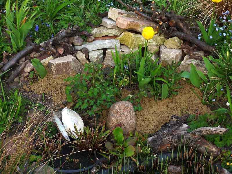 Gerade wegen der Eiablage, habe ich in der Nähe der Burgen Flächen mit Rindenmulch/Sandgemisch. Das wird gerne angenommen. Ich muß nur aufpassen, das Nachbars Katzen es nicht als Klo benutzen.