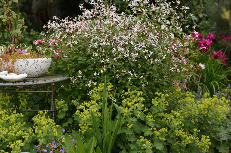 aus dem Garten einer Tante, aber sie ist mir nie habenswert erschienen. Vor drei Monaten habe ich nach einer Staude für einen speziellen Standort gesucht, halbschattig, etwas beengt zwischen Rosen, allerdings von meinem Lieblingssitzplatz gut sichtbar und habe mich auf die G. eingeschossen!