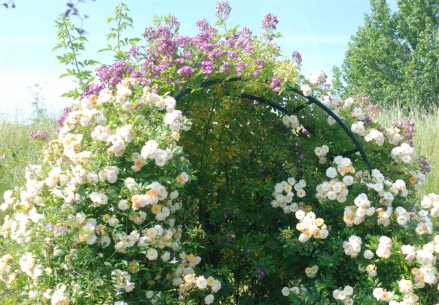 und weil die andere Seite des Rosenbogens durch Deprez a Fleur Jaunes ziemlich bodennah runtergefroren ist übernimmT Cl. Sputnik die Höhe und unten herum Phlomis