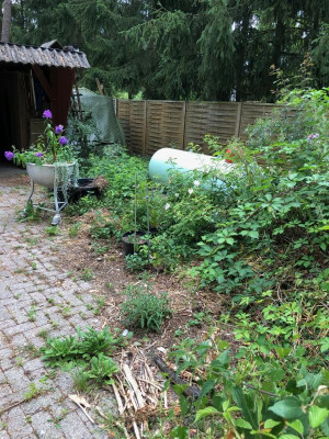 Aber auch, wenn man die Treppe nach unten in den Garten hinterm Haus geht, wird man zur Zeit noch vom Chaos empfangen. Nach dem Streichen der Hauswand letzten Herbst habe ich es vor dem Winter gerade noch so geschafft, das Unkraut ein wenig zu jäten und meine Kletterhortensie zu pflanzen, seitdem ist nichts mehr passiert... ::)