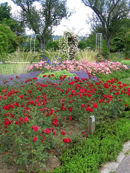 Rosen kann ich nur auf die Seite des Hauses pflanzen, links ist der verbleibende Streifen zum Nachbarn zu eng. Da kommen Einjährige in möglichst ähnlichen Farben wie die Rosen an diesem Bogen hin.Nachdem die Häuser weiss sind, möchte ich Rosen in rosa und mauve in der Mitte: Alexander Girault, Bleu Magenta, Mme. Alfred Carriére, Perennial BlueAn den mittleren Bogen kommt eine der Folgenden: Aimée Vibert, Alister Stella Gray oder Desperez á fleurs jaunes. Die anderen beiden finden ein Plätzchen an anderer Stelle im Garten.