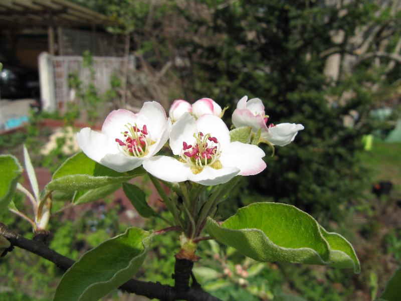 Für mich ist der absolute Star dieser Tage unser kleiner Kochbirnenbaum. Er hat zwar kaum Zuwachs, aber er blüht heuer das erste Mal. GG freut sich jetzt schon auf Birnen, Bohnen und Speck.