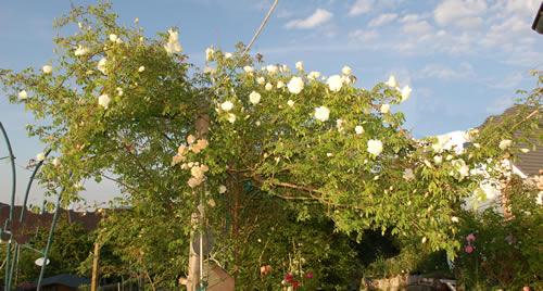Schön sieht sie aus, die Lady, Martina! 8)Ja, erfreulich ist es, dass sich die meisten Teerosen wieder aufrappeln und neue Triebe schieben. Die einen z.T. sogar kräftigere als vorher.Hier kommt mein momentaner Platzhirsch, die Park's Yellow Tea-Scented China.So schön stand sie noch nie da! Mit gegen 6 m weiter über den Angaben im HMF.Die Vermutung, dass es möglicherweise nicht die echte Parks sein könnte, haben wir allerdings schon lange.Allerdings duftet sie nach Tee und auch wenn es eine falsche wäre, ich würde sie nicht mehr hergeben. Nachdem sie die ersten drei Jahre herumgezickt hatte, - mit vielen Blindtrieben im 3. Jahr, zeigt sie sich nun wahrlich imposant in ihrem 5. Standjahr. Der Standort ist nicht unbedingt der beste. Wind und Wetter ziehen heftig über sie her. Im Winter schütze ich sie im unteren Teil mit einer Schilfmatte, da sie direkt in einer Windschneise steht.