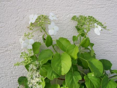 Und H. serrata var yesoensis, eine japanische Berghortensie mit untypisch großem Laub und gezähnten Randblüten.