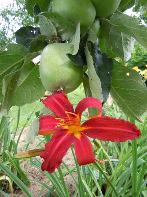 Eine meiner Lieblingstaglilien. Sie wurde hier schon mal gezeigt. "Crimson Pirate" unter herabhängendem Streuobstapfel "Welschisner" (keine Montage, wirklich so