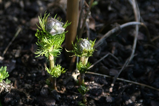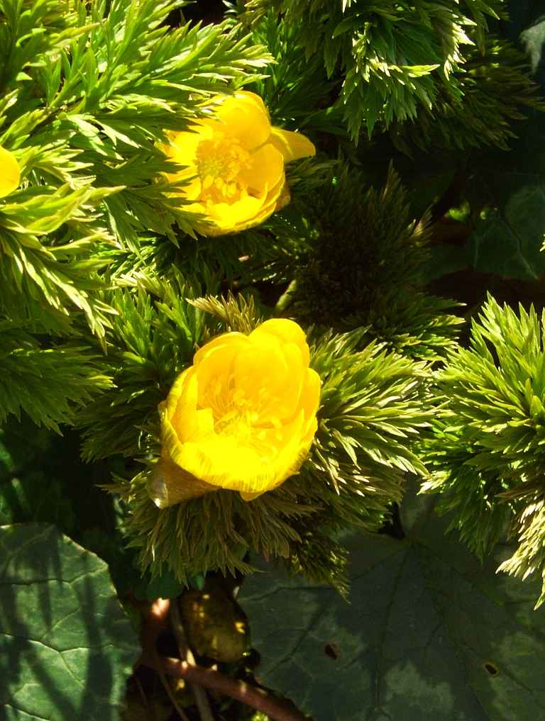 Meine Pflanzen der Adonis Fukujukai (A. multiflora x A. ramosa; syn. Adonis amurensis hort.), obwohl direkt benachbart, zeigen heuer ein eigenartiges Verhalten: der erste Stock ist bereits seit zwei Wochen verblüht, während die beiden anderen erst jetzt in Blüte gehen - trotz oder wegen des milden Winters viel später als sonst. Hier mal einige Impressionen dieser auch laubschönen Pflanze ...