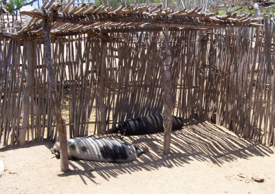 Die Esel haben mehr Schatten als die Pferde, die gesattelt und ohne Wasser am Baum angeleint bleiben.