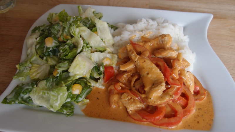 hier gabs paprikageschnetzeltes mit reis. dazu salat mit mais.