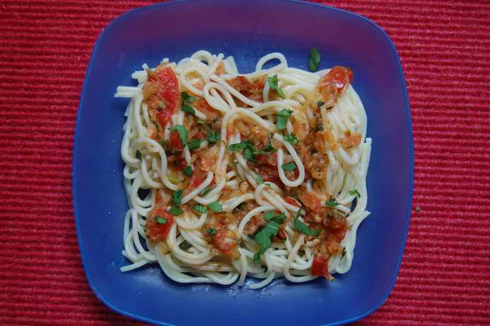 . Hier gab es Spaghetti mit Zucchini, Tomatenwürfel und Ruccola. Abgeschmeckt mit einem Löffelchen Mojo.