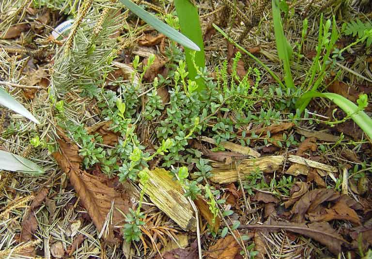 Zum guten Schluß die Cranberry-Sträuchlein. Die sind auch erst im Herbst geplanzt worden und über den Winter grün geblieben. Die Blättchen sind sehr klein, vielleicht 3 x 10 mm. Denen scheint es ganz gut bei mir zu gefallen. Hoffentlich bleibt das so.