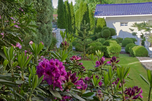 Ich zitiere mich mal selbst. Hier habe ich auf das Problem hingewiesen und was man noch versuchen könnte. Bei einer globalen Bearbeitung wird der Hintergrund schlechter, wenn man den Vordergrund verbessert und umgekehrt.Ein großes Problem ist der sehr große Dynamikumfang. Das Haus und die Umgebung im Hintergrund sind total überbelichtet und der Vordergrund (Rhodos) im tiefen Schatten. Wenn man den Hintergrund abdunkelt und den Vordergrund aufhellt, nähert sich alles dem Mittelgrund an und das Bild bekommt einen HDR-Touch, der mir nicht gefällt. Ich mache nicht selten vorbeugend Belichtungsreihen, z.B. bei Innenaufnahmen mit Fenstern, Sonnenuntergängen und Aufnahmen zur Mittagszeit, aber ich mag nicht den überdrehten HDR-Touch. Wenn, dann ein dezentes HDR oder ein DRI bzw. Exposure Blending oder dich nur eine normale RW-Entwicklung inklusive PS. Mal sieht das eine schöner aus, mal das andere.Ganz sensibel reagierte die blaue Konifere an der linken Seite.Vielleicht könnte man zum Schluß noch den Dynamikregler wieder hochziehen. Da die extremen Tiefen und Lichter beseitigt wurden, wirkt sich das jetzt nur auf den mittleren Teil der Helligkeiten aus. Da könnte man sicher auch durch ein gezieltes Ziehen an der Gradationskurve schaffen. Im Prinzip ist ein Foto nie wirklich fertig bearbeitet, da man immer neue Verbesserungsmöglichkeiten findet. Außerdem lernt man immer wieder zu und eigentlich müsste man das Gelernte jetzt rückwirkend auf die Fotos der vergangenen Jahre anwenden. Aber irgendwann muss Schluss sein, sonst verliert man die Lust.Ich habe nicht den Ergeiz, aus jedem Bild das Allerletzte heraus zu holen. Nur bei Fotos für große Ausbelichtungen und für Wettbewerbsfotos verwenden ich bzw. meine Frau (hat mehr Geduld) auch mal eine Stunde und länger für ein Bild bzw. entwickeln das Bild nach neu erworbenen Erkenntnissen noch einmal neu. Das ist kein Problem, da wir alle Originale unverändert behalten.Vielleicht hat einer eine bessere Idee, wie man es machen kann, ohne dass es unnatürlich aussieht. Bitte dann von Faulpelz die RAW-Datei schicken lassen, das Ergebnis hier herein stellen und möglichst ausführlich beschreiben, wie es gemacht wurde. Nur auf diese Weise können wir voneinander lernen.Man hätte mit etwas Mühe und Geschick die Rhodos markieren und in eine neue Ebene Laden können (auch andere Pflanzen wie z.B. die blaue Konfire. Dann könnte man nur diese markierte Gebiete bearbeiten, so dass sich Änderungen in Sättigung, Farbkanälen usw. nicht auf das ganze Bild auswirken.