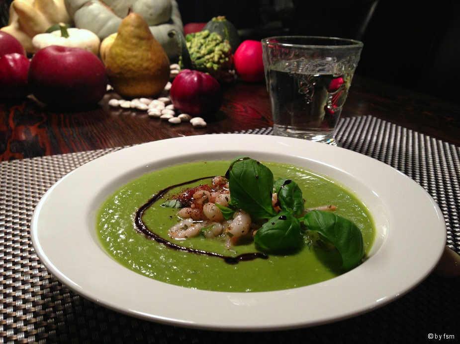 Gestern Abend gab es dann "nur" frische Erbsensuppe mit Sahne aufpüriert mit Nordseekrabbeneinlage und Basilikum sowie Aceto Balsamico-CremeLG Frank
