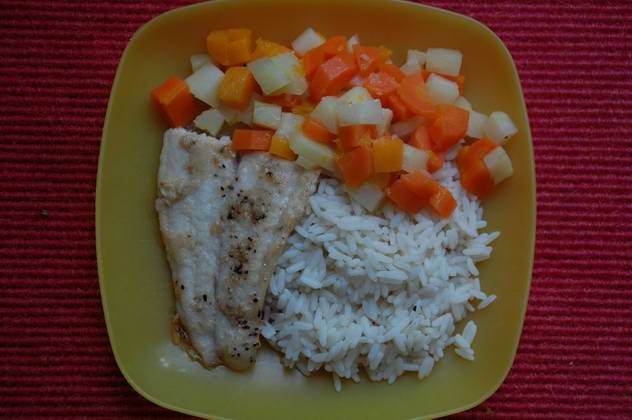 .Heute gab es Reis mit Pangasius (in Montrealsteakpfefferkruste) mit Wintergemüse (Möhre, Pastinake, Kürbis).