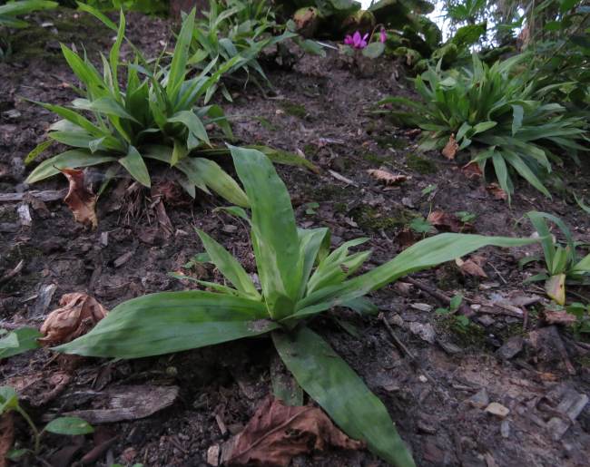 Blaue Gräser gibt' auch im (Halb-) Schatten:Carex platyphylla gibts nur selten. Sieht etwa aus wie eine glauce Carex plantaginea, etwas zielicher vielleicht. Sät sich gelegentlich auch etwas aus.Im Hintergrund sieht man Cyclamen purpurascens Demnächst werden noch mehr davon dazu gepflanzt.
