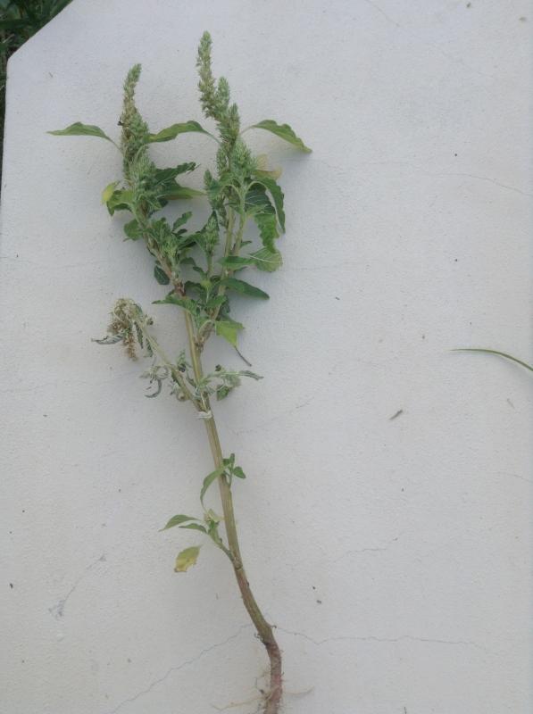 Der zurückgekrümmte Amaranth, Amaranthus retroflexus. Nach einer ersten großflächigen Umgrabe-Aktion im Juli vor etlichen Jahren ist diese Pflanze einige Wochen später massenhaft überall aufgetaucht und in kürzester Zeit 1 m hoch gewachsen. Essbar, habe es aber noch nie versucht. Mittlerweile habe ich den Amaranth im Griff.