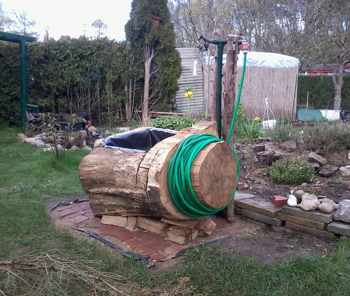 Heute haben wir dann als letzten Schritt das Fass etwa waagerecht justiert und mit Teichfolie ausgekleidet. Und natürlich Wasser reingelassen :DAllen Leuten, die den grünen Gartenschlauch als stilistisch unpassend zu dem rustikalen Behälter empfinden, gebe ich prophylaktisch schon mal recht. An Vorschlägen, einen rusikalen Gartenschlauch betreffend, bin ich allzeit interessiert. Und wenn jemand eine Idee hat, mit welcher Pflanze ich die aufrechten Stangen beranken lassen kann - immer her damit. Für dieses Jahr muss es erstmal ganz profane Kapuzinerkresse sein.