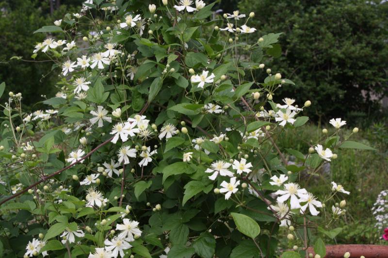 Clematis 'Paul Farges' am Torbogen. Endlich eine Pflanze, die am Tor macht, was sie soll - nach oben wuchern.