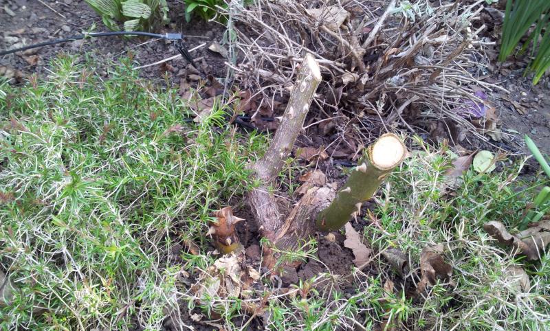 Bin in der schönen Sonne mutig ans Werk gegangen. Auf dem Foto ist zu sehen, was von Novalis noch übrig geblieben ist, nachdem ich unterhalb der Verzweigungen geschnitten und den alten Trieb rechts raus genommen habe.Ich hoffe, ich war nicht zu mutig.