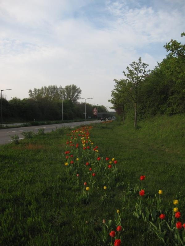 An den großen Einfallsstraßen übernimmt jetzt die Farbkombi rot/gelb. Es sind die Farben der Stadt und die Tulpen wurden vor zweieinhalb Jahren zum Stadtgeburtstag gesetzt.