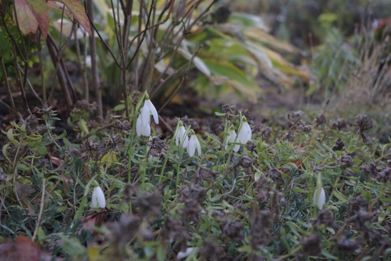 Ich hab' gerade auch mehr oder wenig zufällig zwei blühende Schneeglöckchen entdeckt. Das eine hat das Etikett Galanthus elwesii 'Barnes', das andere Galanthus reginae-olgae (unbenannt). Das hat mich sehr gefreut, da total unerwartet.