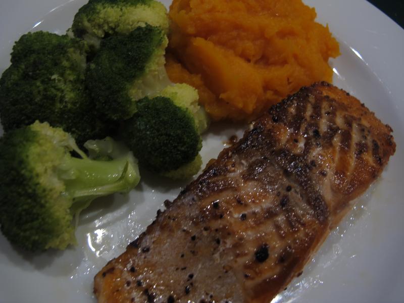 Hier gab es erstmals Süßkartoffel - als Püree, dazu Brokkoli und Lachs. Muß ich nicht unbedingt haben, die sind schon sehr süß :-\