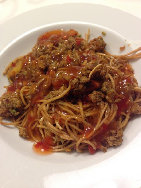 asiabratnudeln mit Hackfleisch und kühlschrankrestgemüsereste