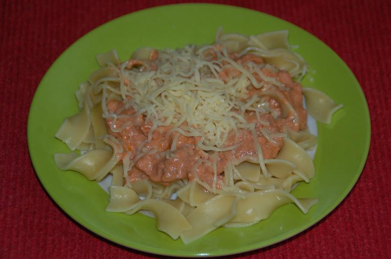 Bandnudeln mit Soße (Knoblauch, Öl, gestückelte Tomaten, Frischkäse, P&S) und Emmentaler