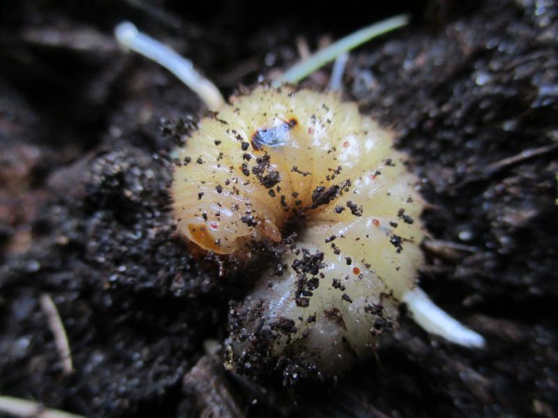 Die Larven sind weißlich gefärbt mit brauner Kopfkapsel und werden bis zu einem Zentimter lang. Sie ähneln Engerlingen, sind jedoch im Unterschied zu diesen beinlos. / bodenschaedlinge.de