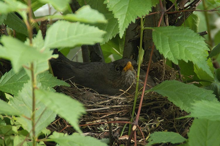 Für mich auch ein typisches Juni-Foto: Amsel versucht zum x-ten und dieses Jahr wahrscheinlich letzten Mal, ein Nest zu Ende zu bebrüten. Bis jetzt war's nichts mit Nachwuchs (v.a. wegen Elstern, Eichelhähern, Eichhörnchen ...).Dieses Nest hier ist direkt neben unserer Haustür - ca. 60 cm entfernt. Wir tun immer so, als sähen wir sie nicht