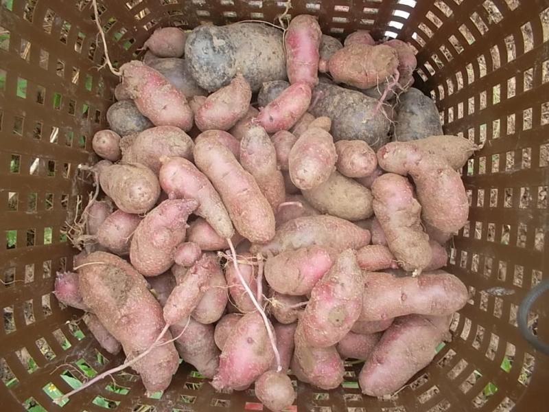 Letzte Woche habe ich einen Teil meiner Blue Congo bzw. blauen Schweden rausgemacht. Der Ertrag ist umwerfend, lauter Riesenknollen. Außerdem noch ein paar wenige rosa Tannenzapfen.