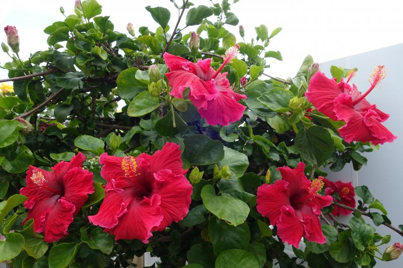 An der Seite schöne Hibiskus-Stämme im Kübel.