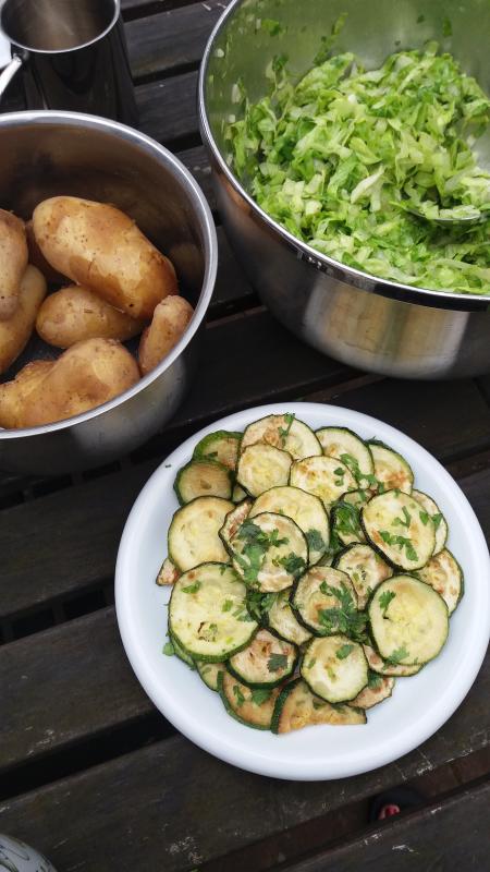 Wir sind am Wochenende aus Rumänien zurückgekommen. Gestern Mittag gab es nach einem Rundgang durch den Garten gebratene Zucchini, Pellkartoffeln und Salat.