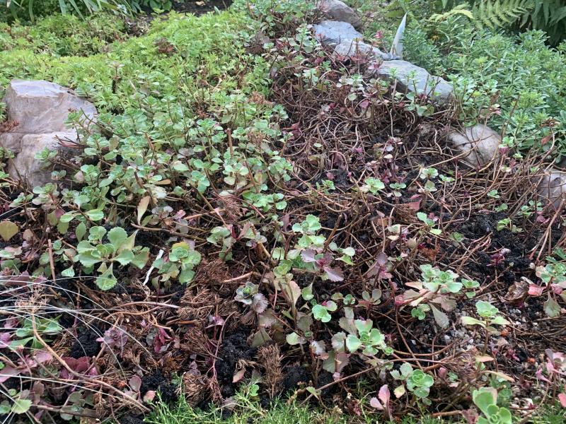 Stecklinge von diesem Sedum und auch Babyrosetten von Jovibara kann ich im Herbst oder im Frühling verschenken, es landen ohnehin in jedem Jahr überflüssige in der Biotonne.