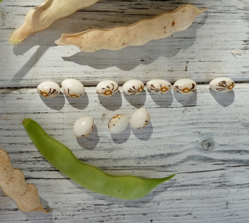 Ringelnatz, die dürreresistente, namenlose Stangenbohne hat grüne Hülsen und die Kerne sind weiß mit einem hübschen Muster. Die Blüten sind auch weiß. Bild der Blüten: