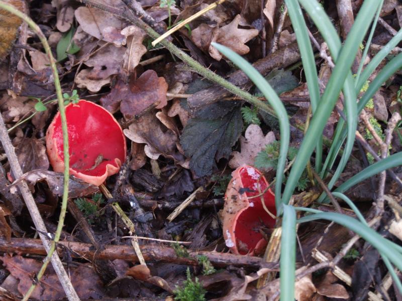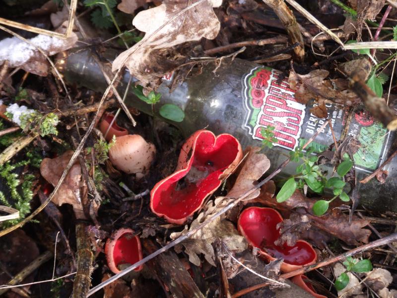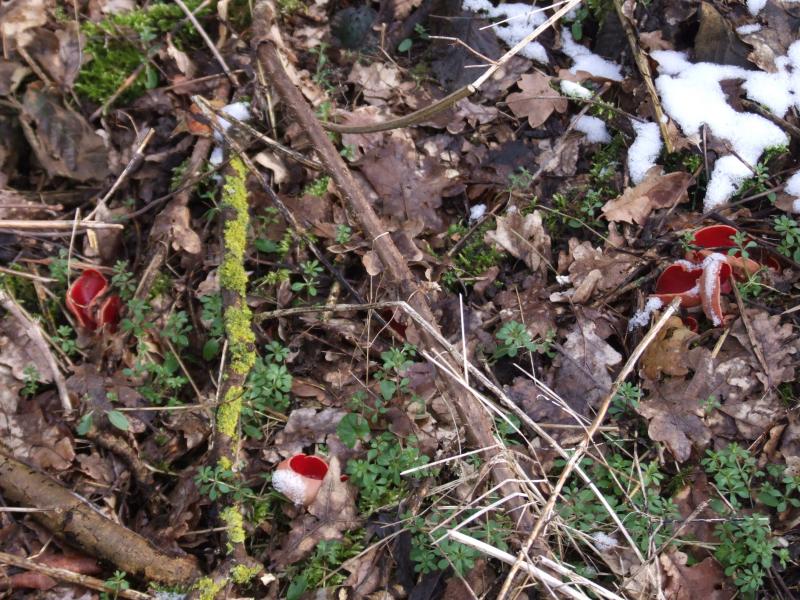In den kleinen Wäldchen bei unserem Dorf sind verschiedene Gartenpflanzen verwildert, aber auch Schneeglöckchen, wie man hier sieht. Viel auffälliger als die bereits verblühten Schneeglöckchen war dieser leuchtendrote Becherling daneben.