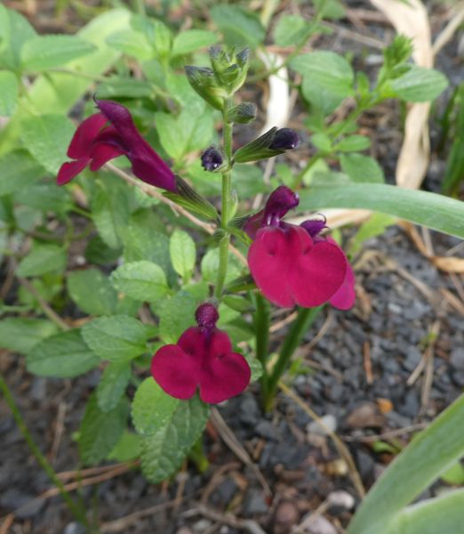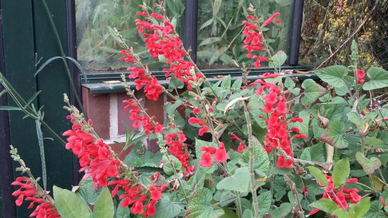 Mein England-Mitbringsel, Salvia microphylla 'Marron' blüht schon eine ganze Weile. Er steht ziemlich trocken und lange Zeit wohl auch zu mager. Jetzt, nach etwas Düngung blüht er ganz nett. Überwintert habe ich ihn auf der Fensterbank in dem winzigen Töpfchen, in dem ich ihn erstand, immer bedroht von Attacken der Weißen Fliege. Als ich schon befürchtete, ihn nicht durchzubringen, habe ich Stecklinge gemacht - erfolgreich!