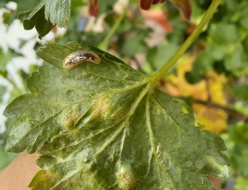 Blasenlaus (oben rechts) an der Josta und eine Schwebfliegenmade steht schon parat um sie zu fressen.