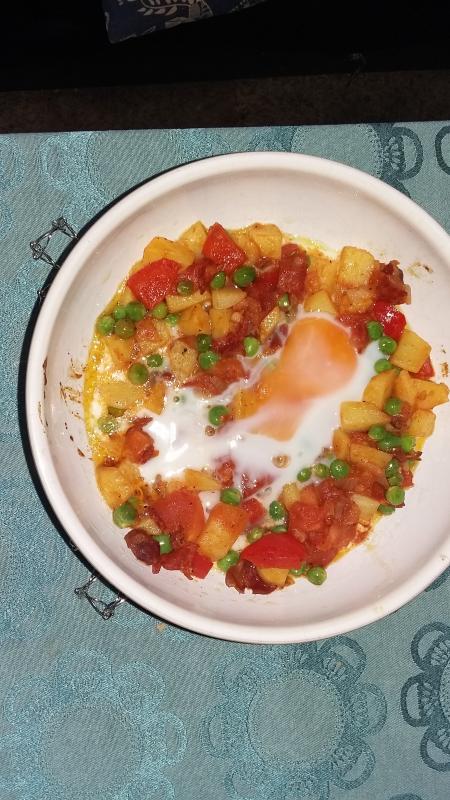 Eier mit Gemüse (spanisches Rezept): Kartoffeln, Zwiebel, Knoblauch, rote Paprika, Erbsen, Tomaten, Serrano-Schinken, Chorizo - mit Eiern überbacken.