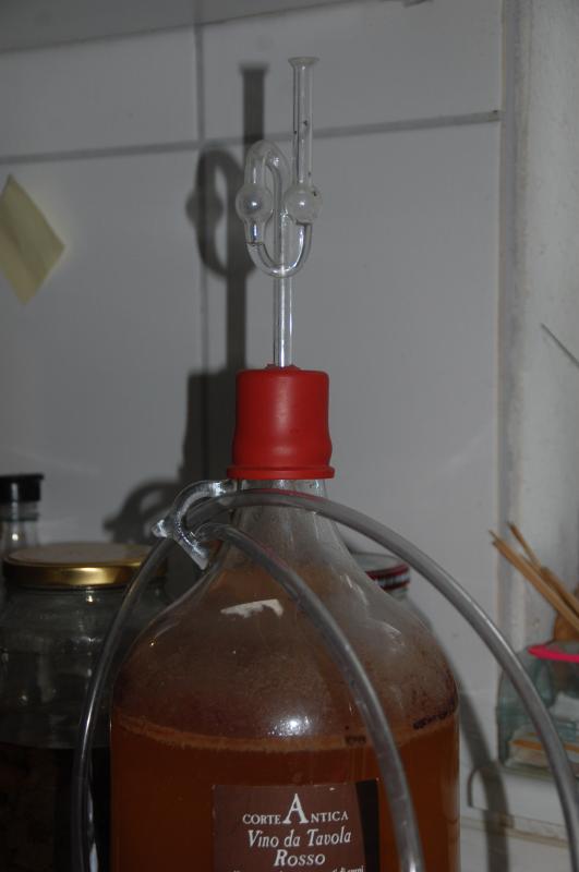 Wissenschaft ??? ja, nee, ist nur Natur ;). In größeren Baumärkten gibt es zur Saison meistens Zubehör. Also auch Kruken, Gärröhrchen in versch Varianten und den passenden Stopfen/Korken. Die Korken aus Gummi sind irgendwie praktikabler. Noch einen guten Meter durchsichtigen Schlauch dazu. Viel mehr brauche ich nicht für die Weinbereitung (siehe Bild - Gärballon ist so eine 5L-Weinflasche). Dagegen wird es mit weniger Zubehör schwierig, aber machbar 8). Habe ich auch schon getestet.