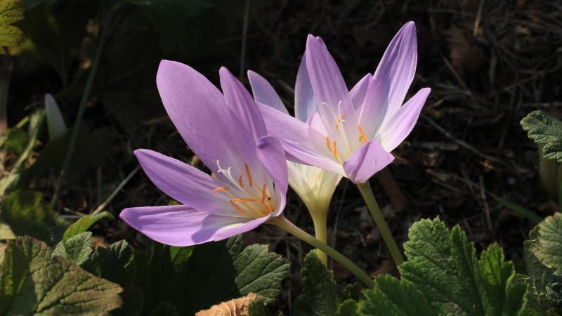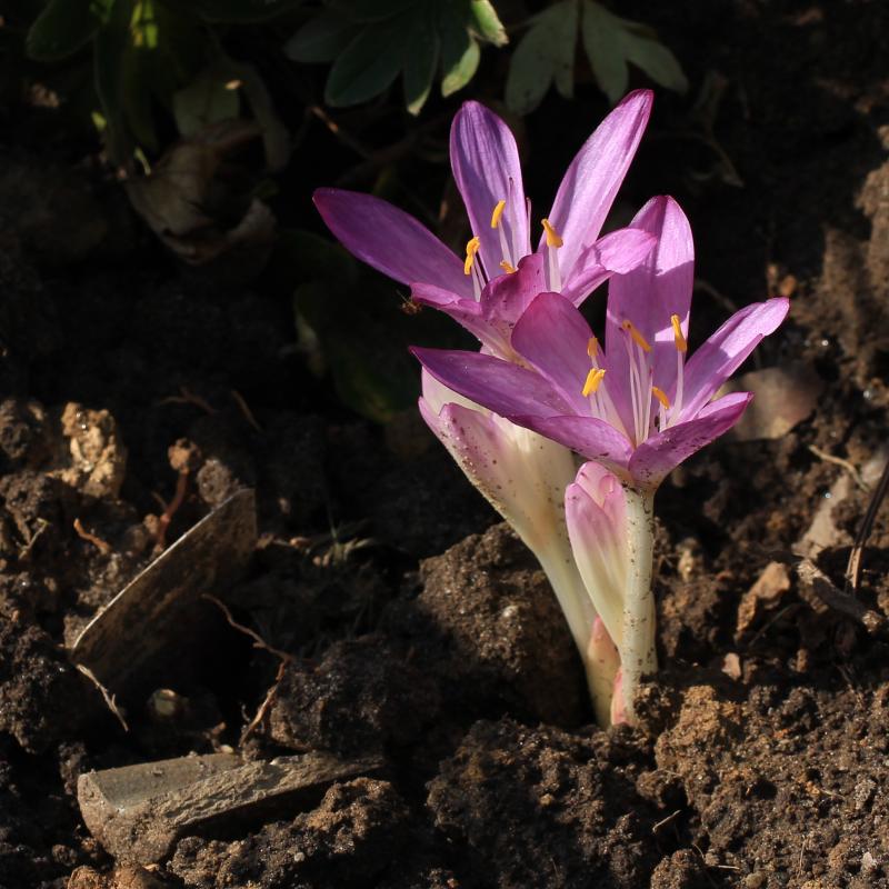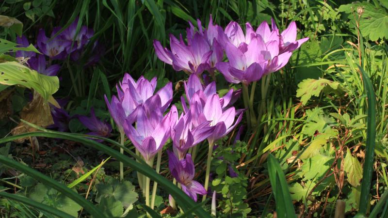 Diese Form der einheimischen Herbstzeitlosen sprießt dagegen aus einem dichten Teppich anderer Pflanzen, die den Boden feuchter halten und den Schnecken Schutz gewähren. Die haben ihre Chance offensichtlich genutzt.